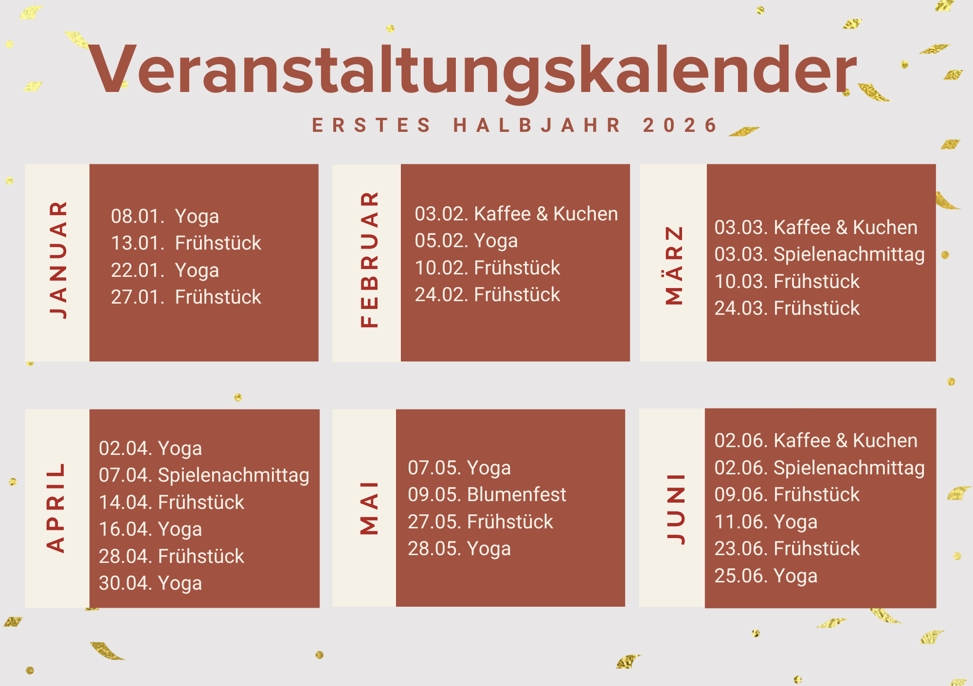 01.01.2026, 00:01 Uhr - 16.07.2026, 23:00 Uhr Termine 2026 1. Halbjahr Wichtige Termine für die Mieter der Lehrter Wohnungsbau im 1. Halbjahr 2026. Details zu den Terminen finden Sie auf den Monitoren im Treppenhaus. Programm 1. Halbjahr 2026 herunterladen (PNG, 319 kB) herunterladen